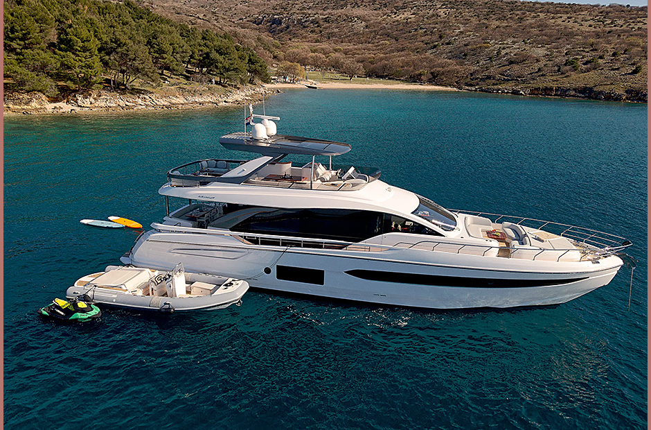The expansive flybridge is a true highlight, featuring generous sunbathing areas, a stylish bar, an ice maker, and a barbecue setup. At the bow, a large lounge invites guests to relax and enjoy panoramic sea views, while the shaded aft deck is perfect for alfresco dining. The hydraulic swim platform ensures effortless access to the sea and water toys.