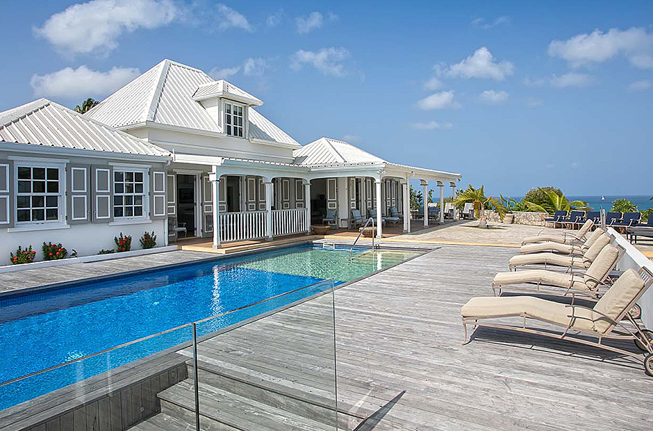 This seven bedroom villa accommodates up to 14 guests and it has been recently remodeled and combines traditional French Caribbean architecture on the outside with the comfort and convenience of modern interiors. A large blue mosaic-lined infinity pool provides the centerpiece for the main terrace and overlooks both the Caribbean Sea and the Simpson Bay Lagoon with Dutch side St. Maarten in the distance. The terrace is paved with stone and hardwood decking surrounds the pool with elegant sun loungers for sunbathing. A spacious poolside gazebo provides a plush outdoor living space with plenty of shade from the sun and the ideal spot in the evenings to view the beautiful Caribbean sunsets. A second covered area equipped with a gas BBQ and wet bar provides alfresco dining and a beautiful sea view.